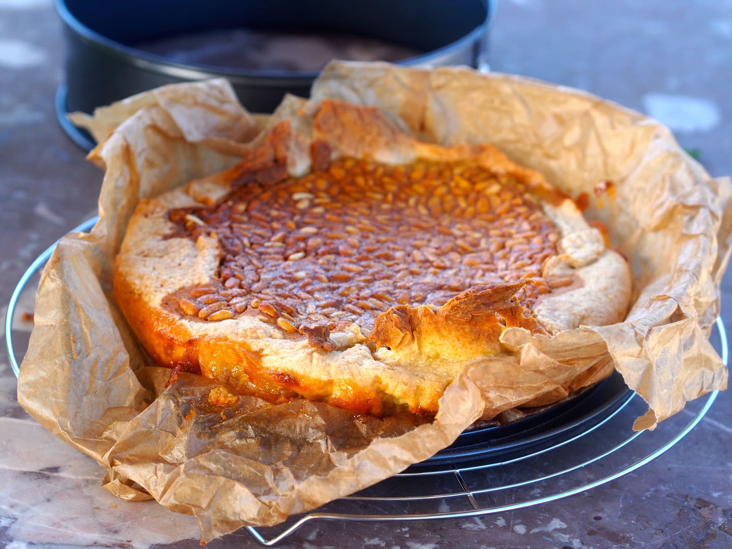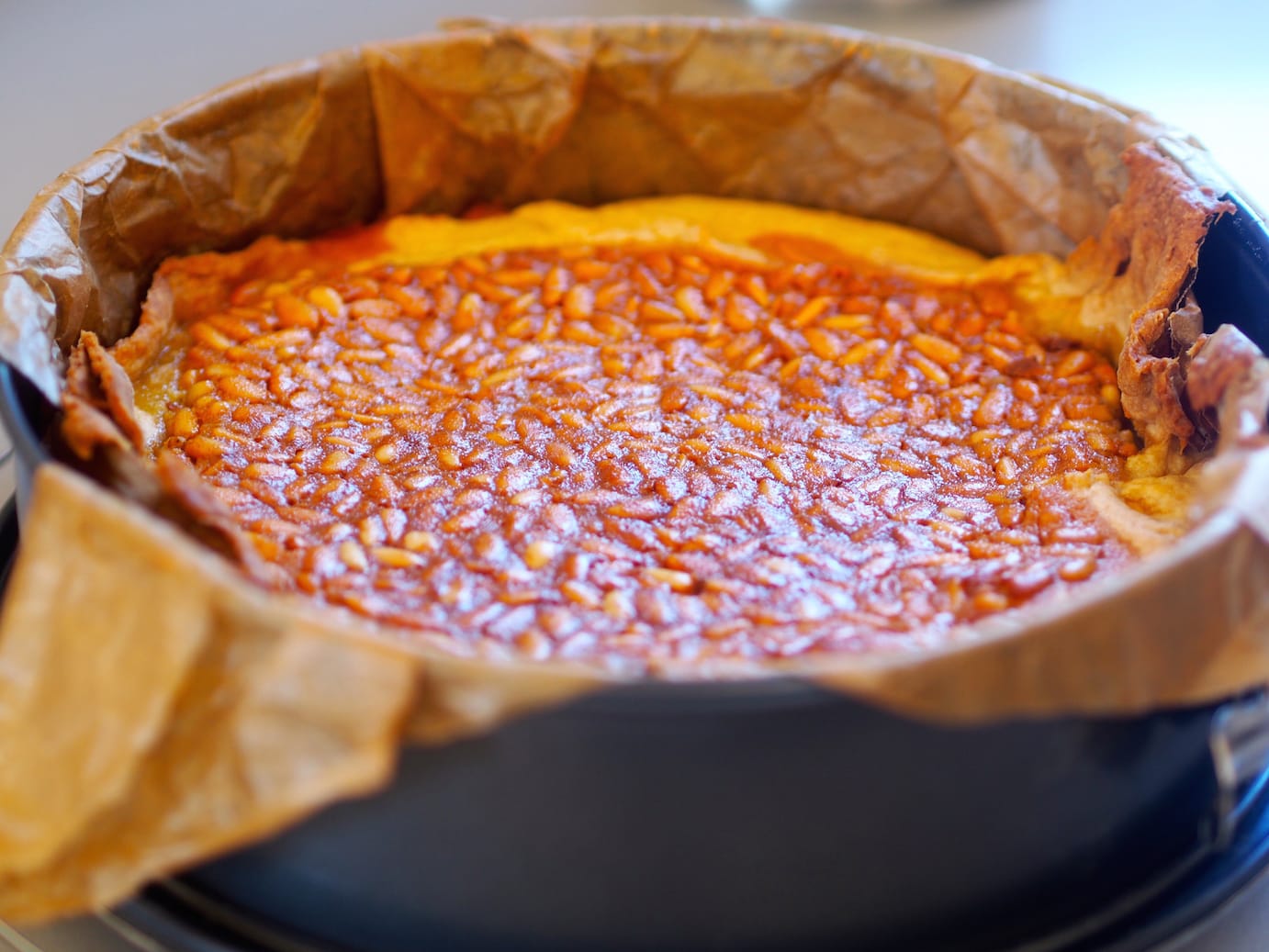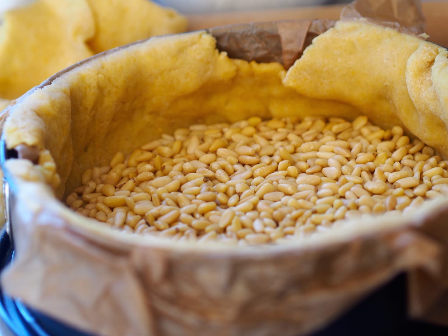 Ota piiraspohja jääkaapista, levitä sille pinjansiemenet ja kaada täyteseos niiden päälle.