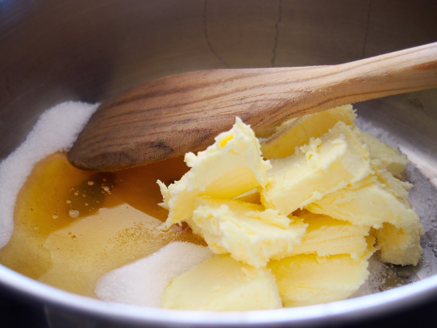Yhdistä SAM Hunaja, sokeri ja suola kattilassa. Lisää voi ja anna poreilla hetki keskilämmöllä koko ajan sekoittaen. Ota liedeltä ja anna jäähtyä vartti.