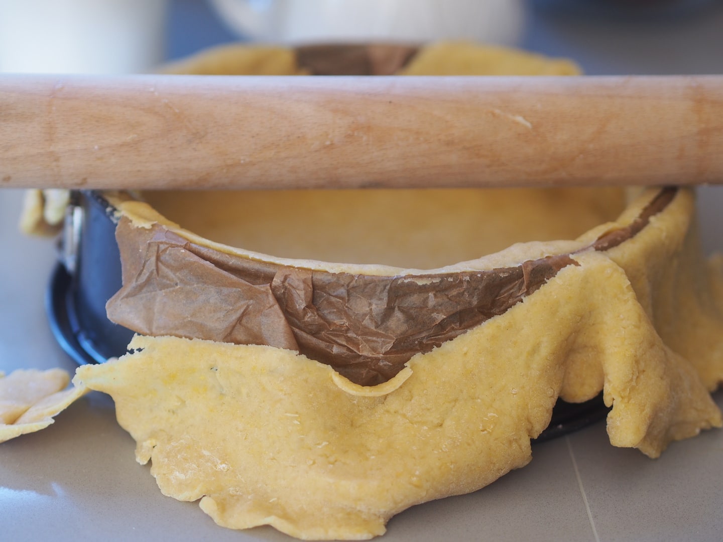 Levitä kaulittu taikina piirasvuoan päälle, painele se hyvin vuokaan ja pyöräytä sitten kaulinta reunojen päällä niin, että ylimääräinen taikina irtoaa pois.