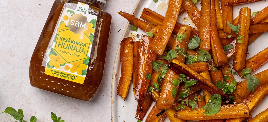 Uunissa karamellisoituneet porkkanat hunajan, balsamicon ja yrttien kera. Täydellinen pari grilliruoalle, juhlapöytään tai ihan vaan arjen luksukseen. Helppoa ja herkullista.